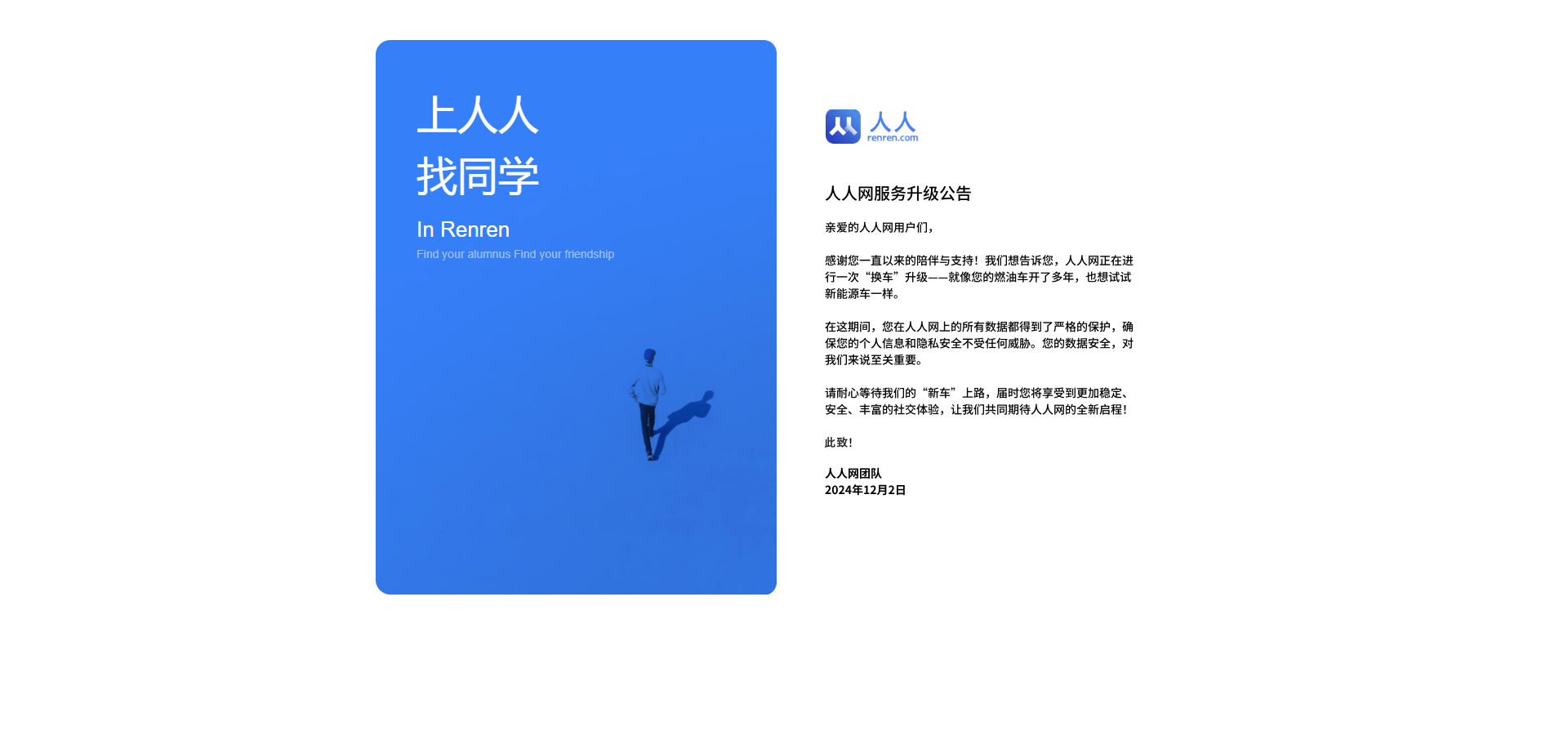 請(qǐng)耐心等待我們的“新車(chē)”上路,屆時(shí)您將享受到更加穩(wěn)定安全、豐富的社交體驗(yàn),讓我們共同期待人人網(wǎng)的全新啟程!